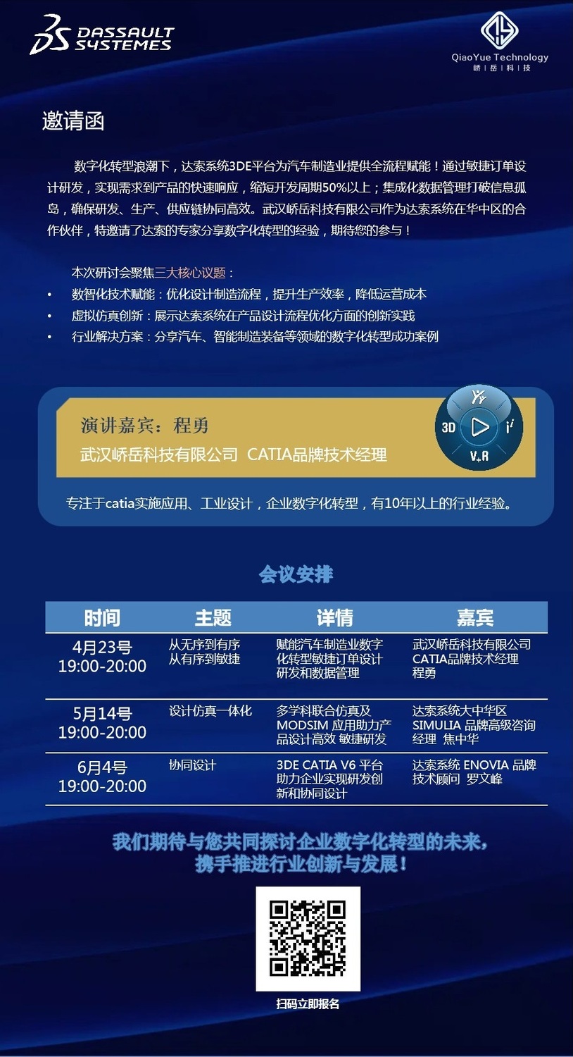 为帮助汽车制造零部件生产企业更好的实现数字化转型,本周三(4月23日)晚上七点,将会由武汉峤岳科技有限公司CATIA品牌技术经理程勇为大家带来第一场线上讲座:如何实现从无序设计到有序设计,从有序设计到敏捷设计。